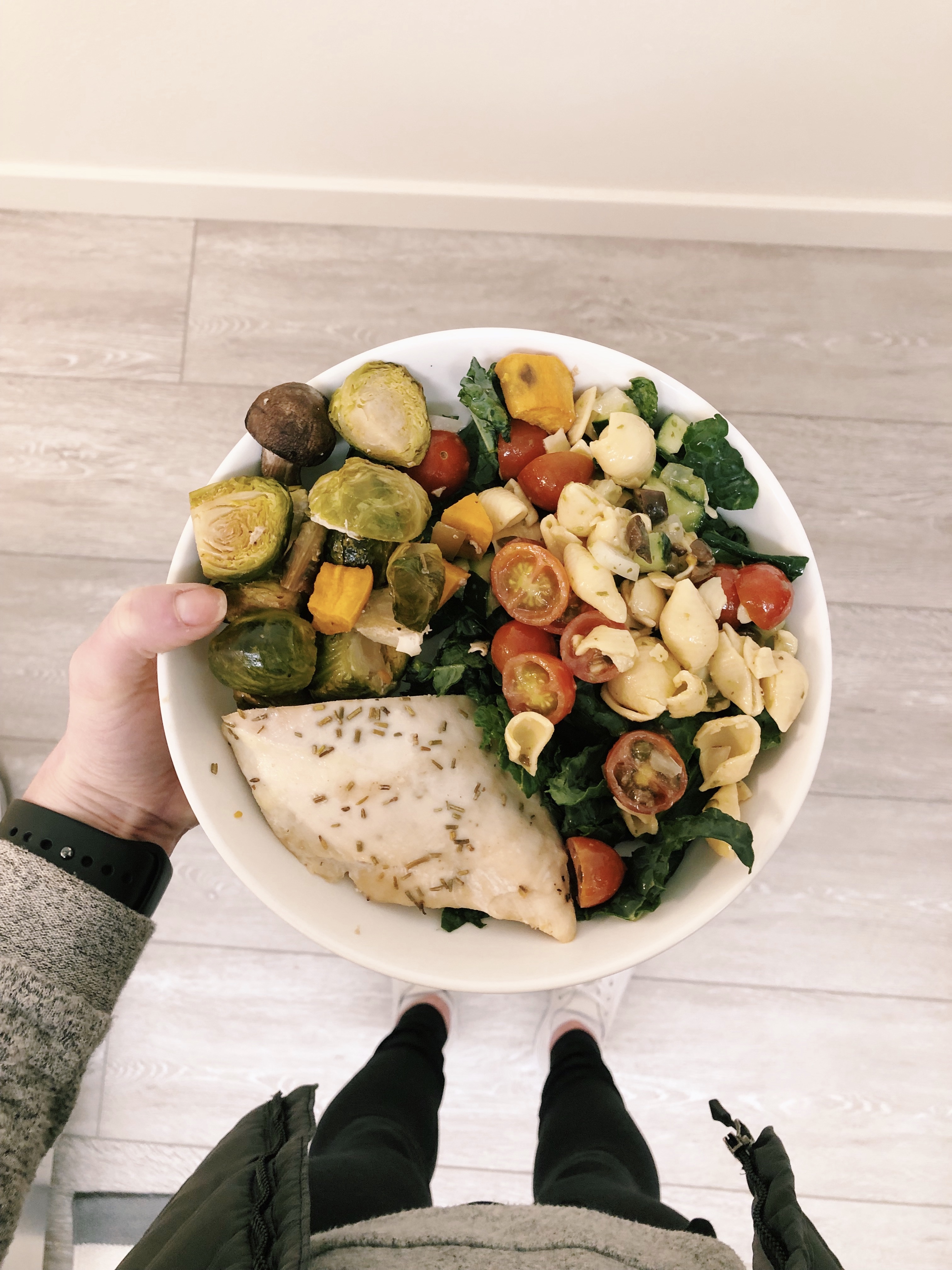 Paired with oven-roasted chicken, Brussels sprouts, squash, and mushrooms
