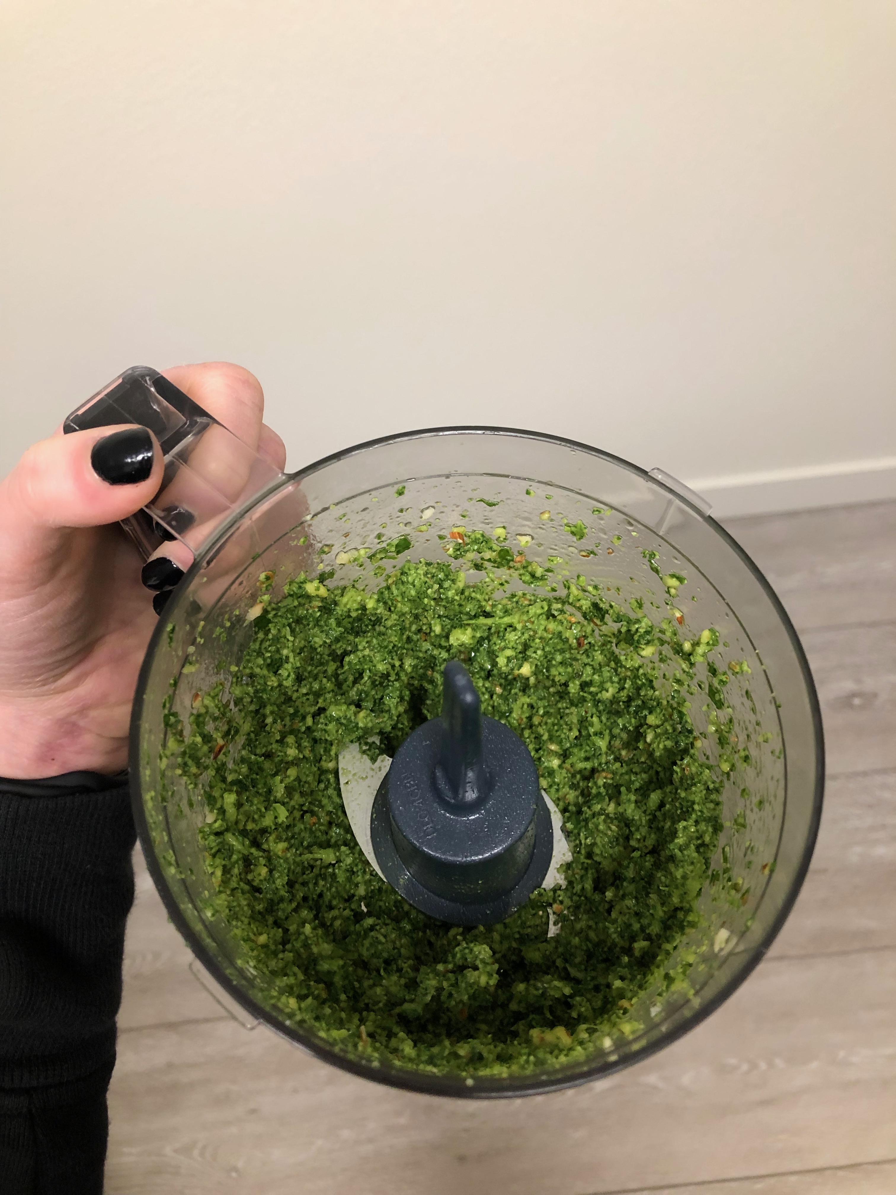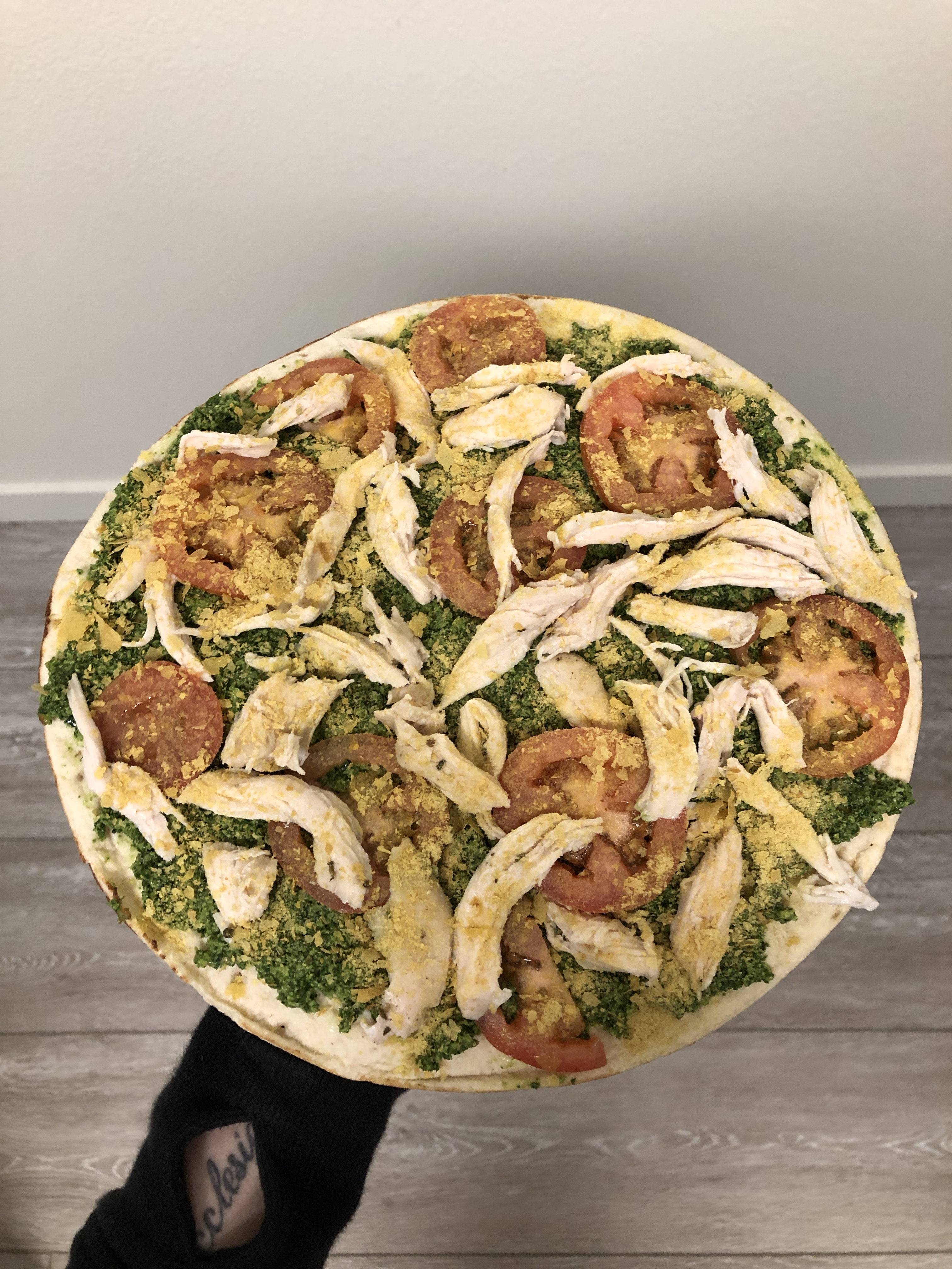- Remove pizza crust from box (it should still be frozen) and spread pesto onto crust