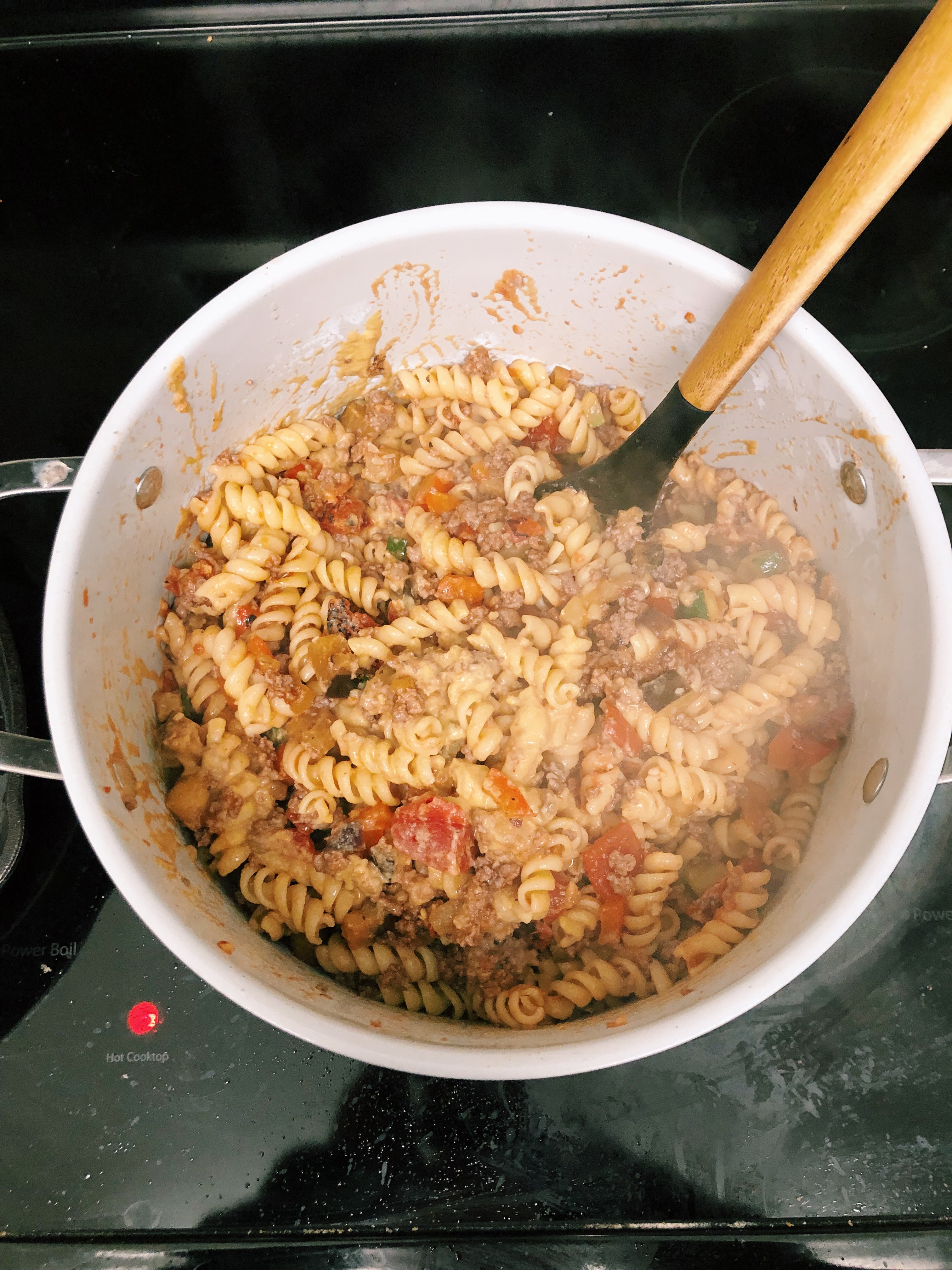 - Once both pasta and beef are cooked, drain and combine in large pot