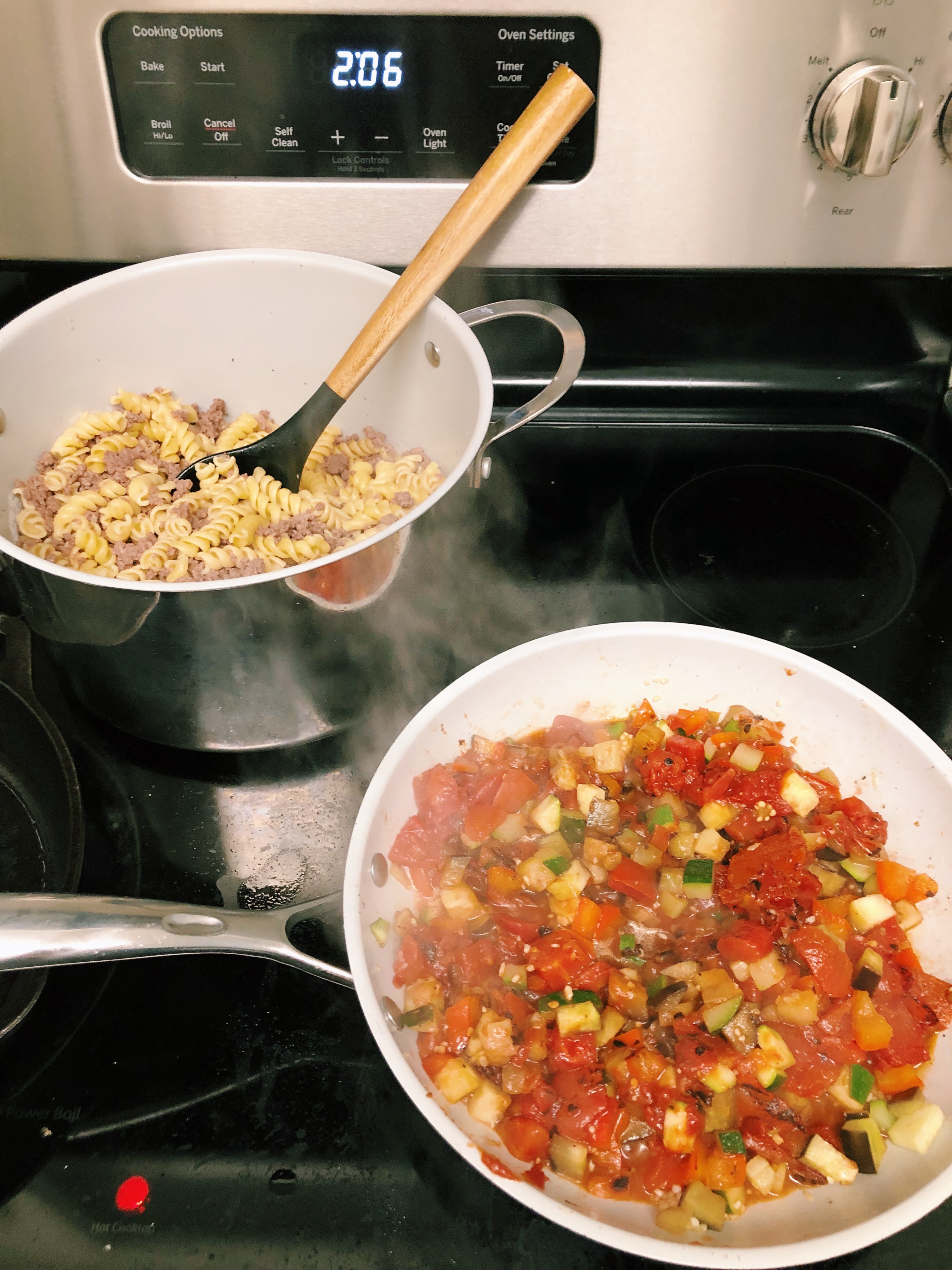 - In a large frying pan, combine zucchini, eggplant, bell pepper, onion, avocado oil, and garlic. Cook over medium, stirring frequently.